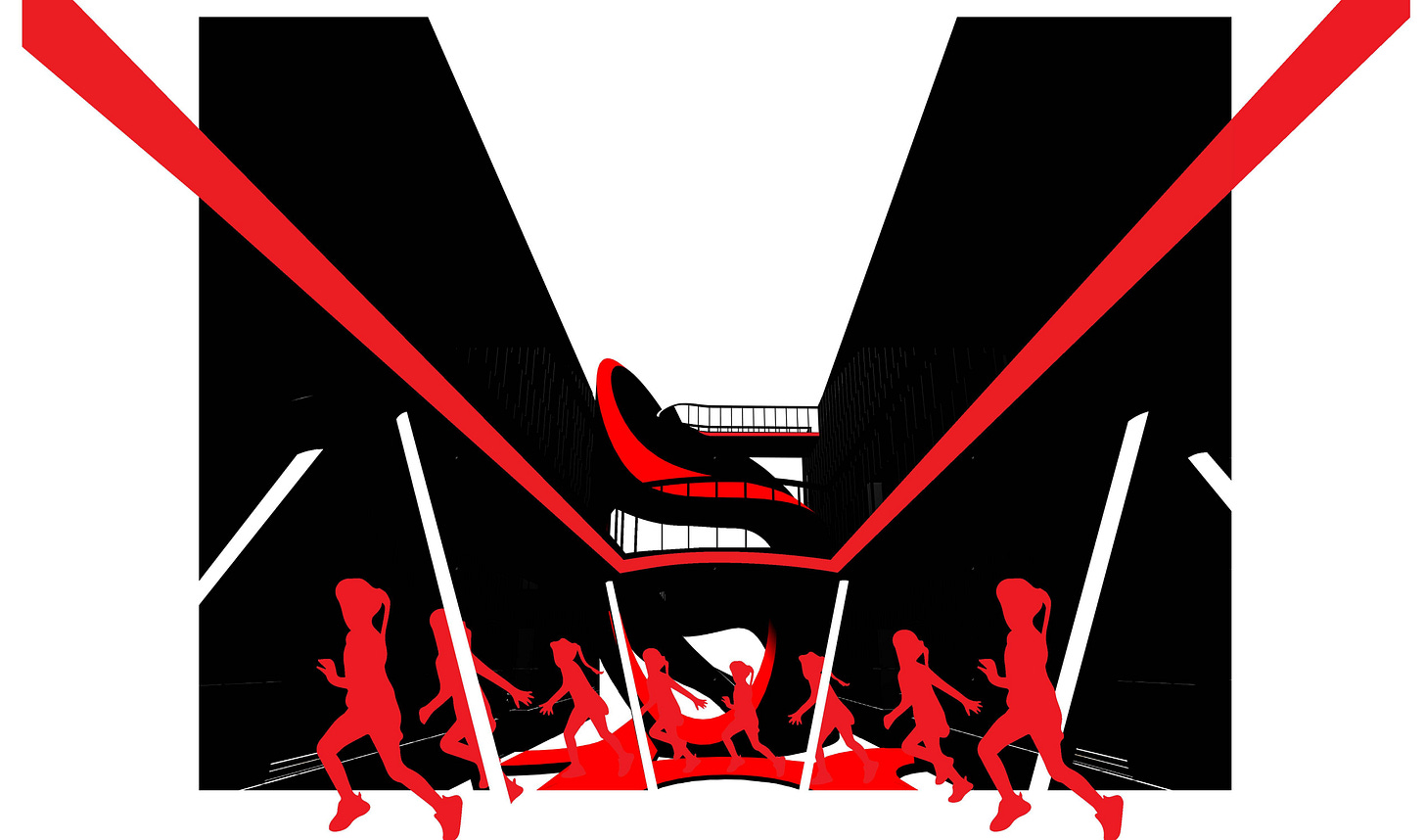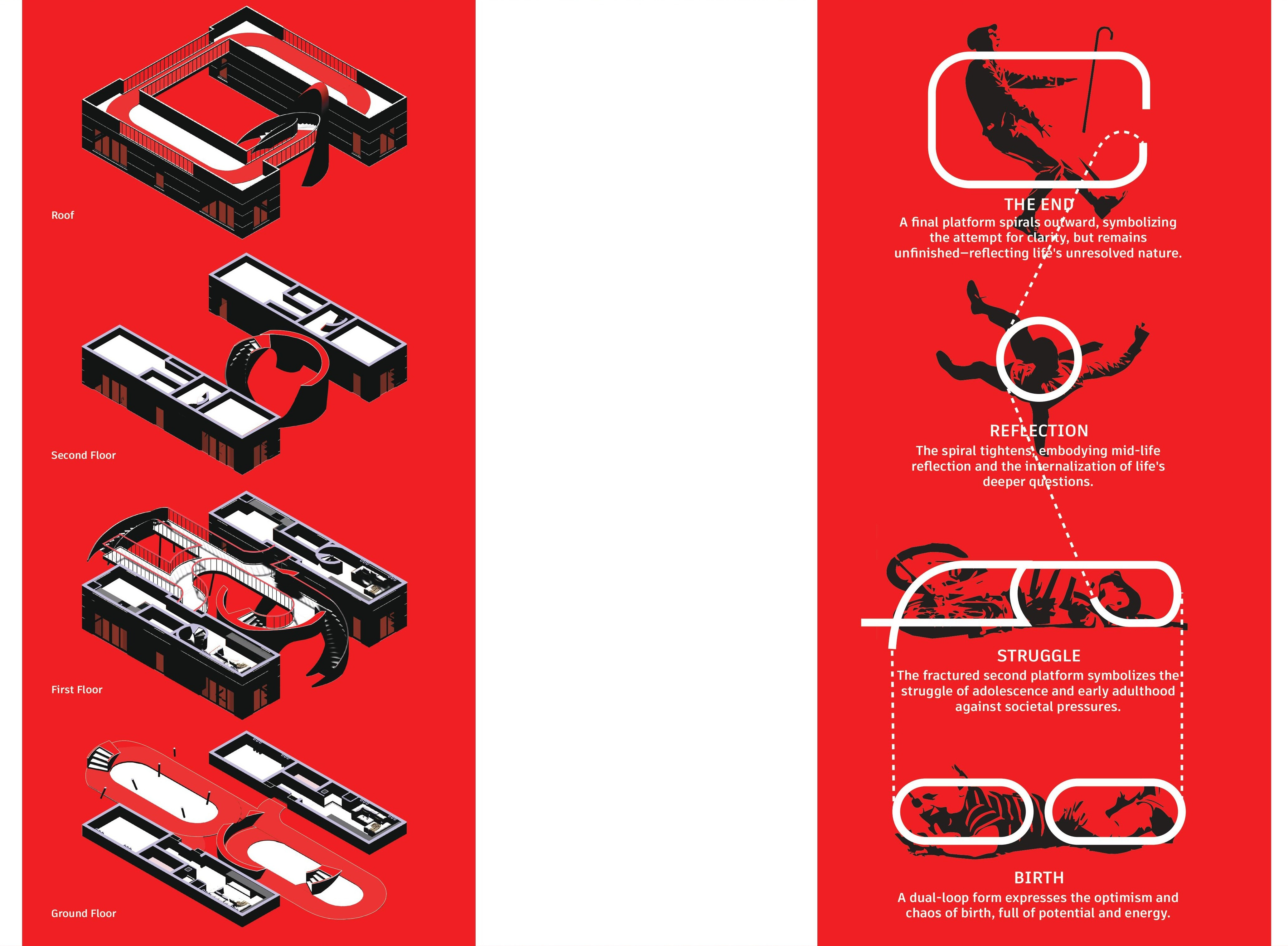 On the first level, a dual-loop form captures the intensity and optimism of birth: chaotic, yet full of optimism and endless possibility. The second platform, representing adolescence and early adulthood, fractures and twists the previous loop — symbolizing the constant battle to define oneself amidst the expectations and constraints of family, society, and biology. The third stage is one of introspection. Here, the form tightens, pulling upward in a more contained spiral, creating the form of a circle moving upward. It reflects the questions that surface in the later stages of someone’s life, a mid-life reflection period with questions such as: Was it worth it? What can still be changed? The architecture compresses, mirroring the internalization of those thoughts.