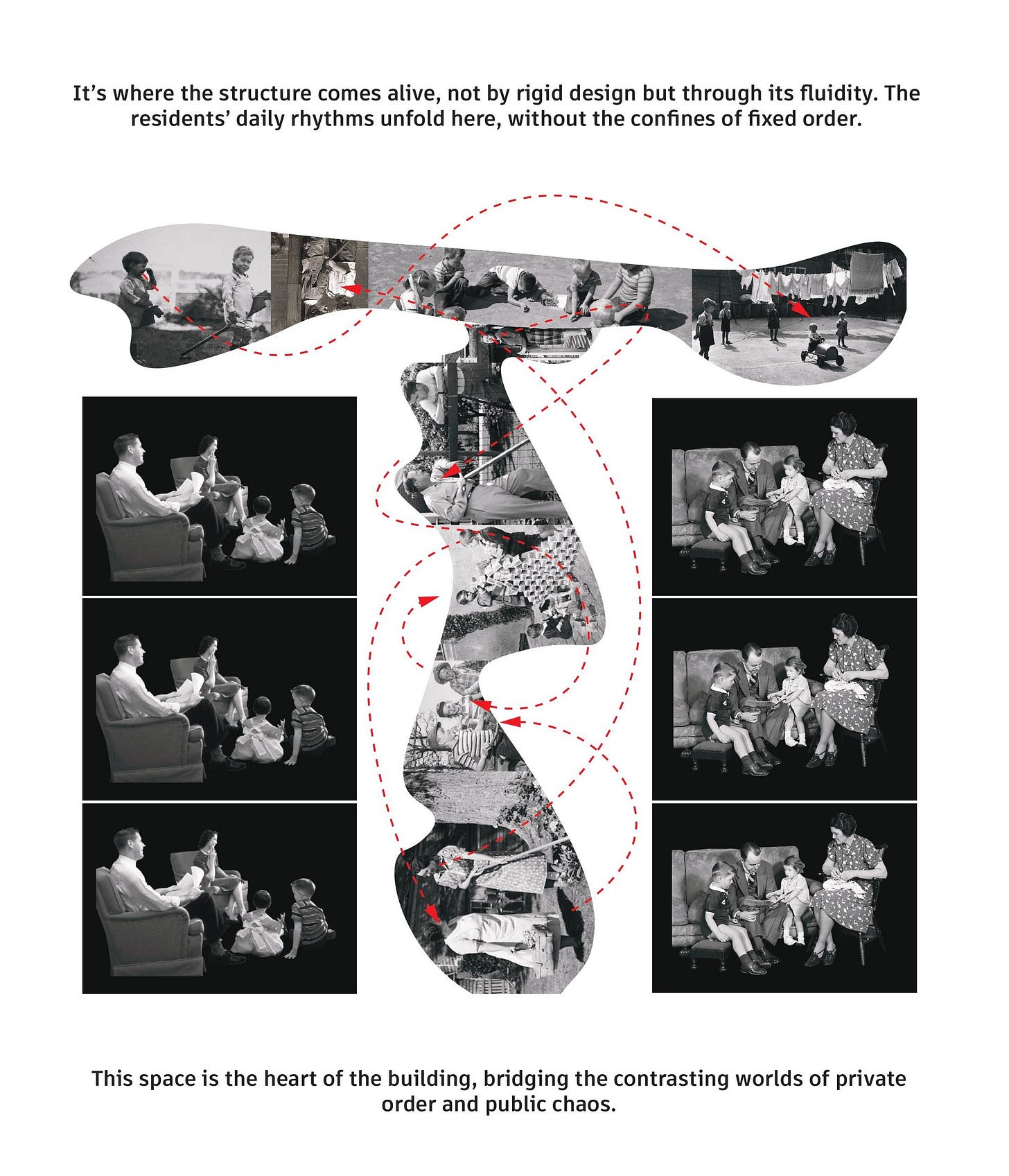 Unlike typical multi-family housing, where individuality is confined behind walls and community often feels manufactured, this typology reorients the idea of identity. Here, the individuality lies not only in each unit, but in the collective behavior of its residents. The social zone, if the typology is replicated elsewhere, allows for architectural flexibility — it can be tailored, adjusted, designed, reshaped, redesigned depending on who lives there and what they need. In one iteration, it might serve as a series of gardens or informal gathering spots; in another, it might become a playground, a gallery, or a vertical park. This, ideally, gives “power” not only to the architect to design, but also to the residents to propose their needs and wants. Even if the scenario that the building is replicated identically elsewhere, the center — the space of chaos — is always different. Because people are different. Routines are different. What binds them together is not a fixed formula, but an adaptable scaffolding for life.