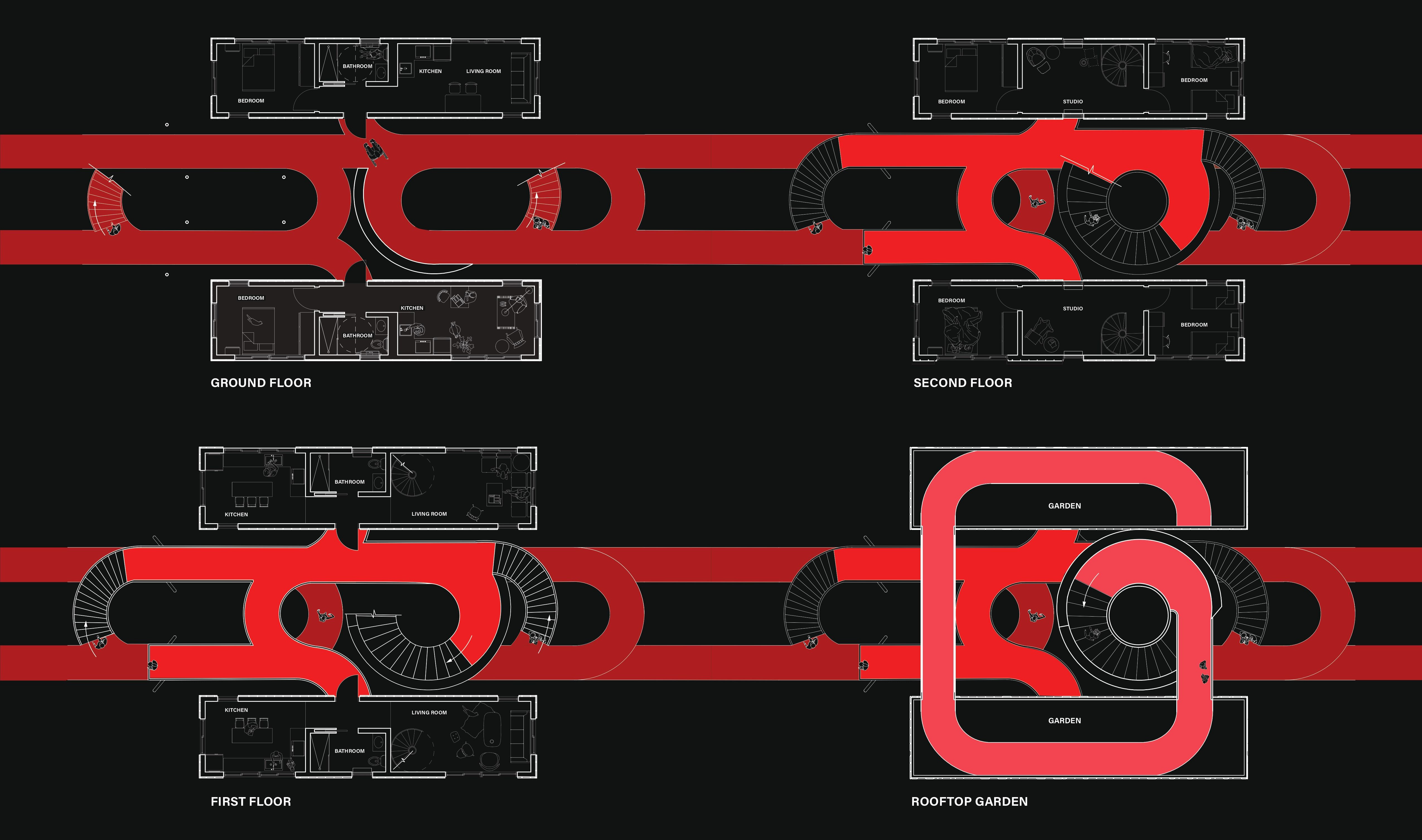 In this version, the units are stacked on either side of a central void, creating a sense of communal individuality, where each unit’s identity is defined not in isolation, but through its relationship to the collective whole. This void becomes the project’s spatial and symbolic heart: a vertical social zone that threads through every floor. It is where movement happens, where people cross paths, where architecture becomes alive and unpredictable. The homes themselves may be formally ordered, their elevations aligned, but what unfolds between them is anything but rigid. Life — messy, spontaneous, emotional — takes shape in this shared middle.