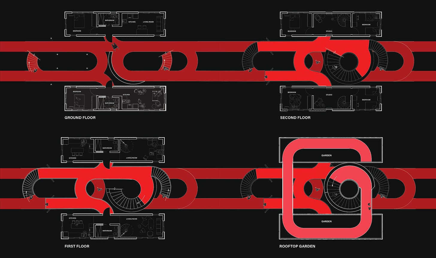 This idea is crystallized in the central sculptural element — a twisting vertical structure that houses circulation, pauses, and moments of reflection. A stair climbs through it like a snake wrapping around a tree, revealing and concealing paths as it weaves upward. The stair is not just a connector, but a metaphorical journey through life’s stages, embodied in the platforms and architectural gestures encountered along the way.