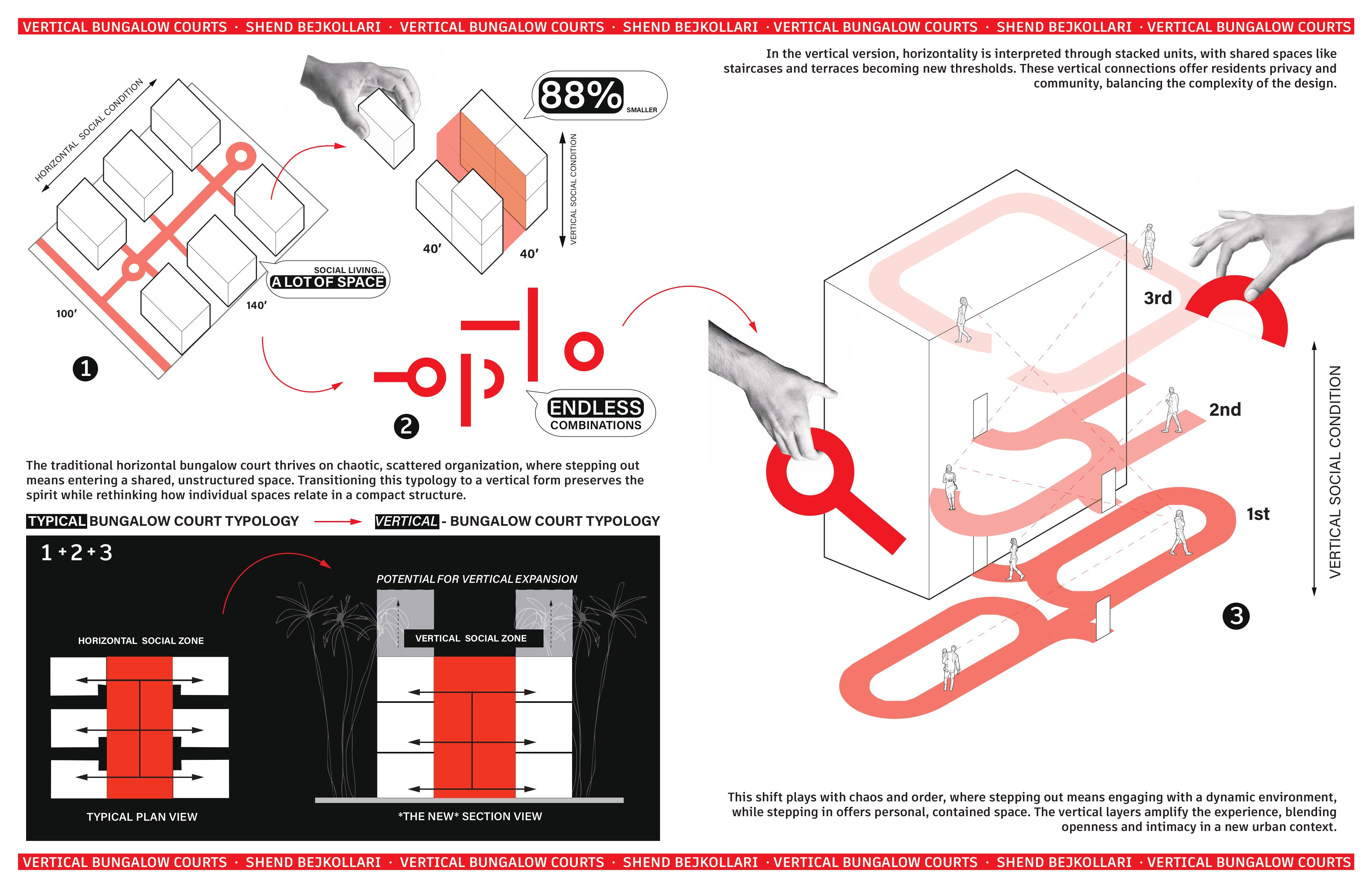 The answer began with reimagining the bungalow court through the lens of dimensional transformation. Much like the inhabitants of Edwin A. Abbott’s Flatland, who were constrained by two-dimensional thinking, traditional bungalow courts occupy a horizontal plane. But what happens if we flip that social space vertically? In this project, the social zone is extruded upward, layered floor by floor between two vertical blocks of residences. By adding verticality, we give depth to the typology, creating a new architectural language that brings with it fresh opportunities for interaction, ritual, and complexity.